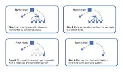 垃圾回收器定期扫描对象,并计算引用了每个对象的其他对象的数量。如果一个对象的引用数量为 0(没有其他对象引用过该对象),或对该对象的惟一引用是循环的,那么该对象的内存即可回收。图 1 显示了垃圾回收器回收内存的一个示例。