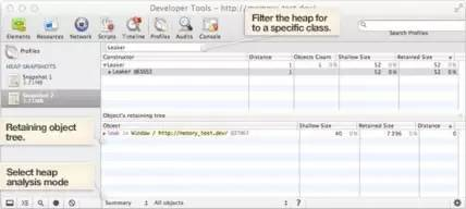 理想的解决方案是浏览器供应商在浏览器中提供一组工具,帮助您监视内存使用,识别泄漏的对象,以及确定为什么一个特殊对象仍标记为保留。