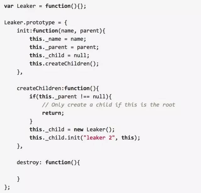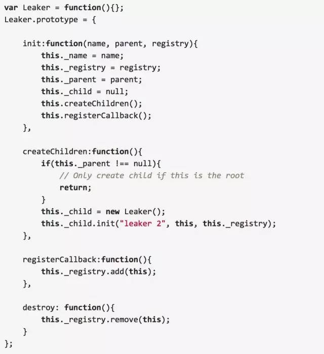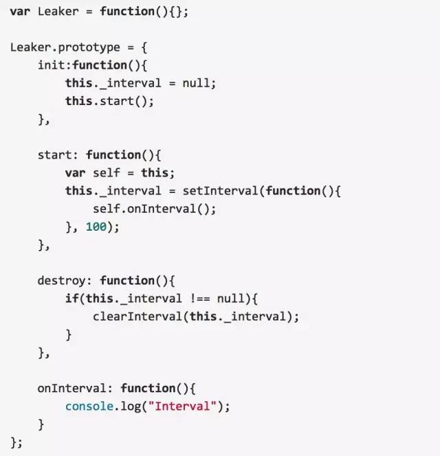 要确保对 setInterval 方法的回调在访问 Leaker 实例的范围时执行,需要将 this 变量分配给局部变量 self,这个变量用于从闭包内触发 onInterval。当 onInterval 触发时,它就能够访问Leaker 对象中的任何实例变量(包括它自身)。