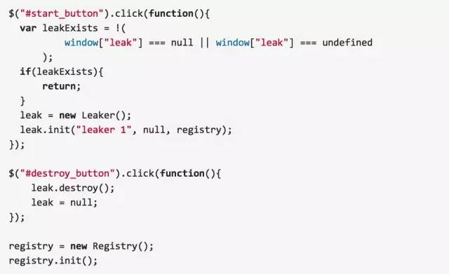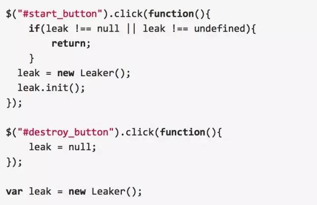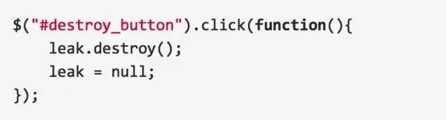 要解决此问题,可在清空所存储的 leaker 对象引用之前,触发添加到该对象的 destroy 方法,方法是更新 Destroy 按钮的单击处理程序,如清单 5 所示。
