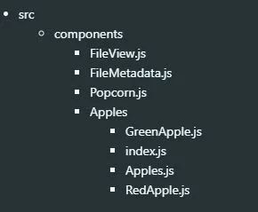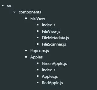 我们可能想把 FileView.js 和 FileMetadata.js 抽象到目录结构中,像 Apples- 那样,特别是如果我们希望添加更多与文件相关的组件,比如 FileScanner.js 。这就是 folderize 可以为我们做的事情,这样它们就可以具有以下类似结构: