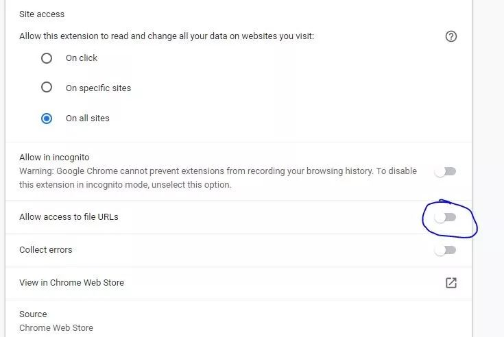 如果您在查看结果时遇到问题,可以在 地址栏上输入 chrome:extensions,找到 React Sight 框并单击 Allow access to file URLs 开关,如下所示: