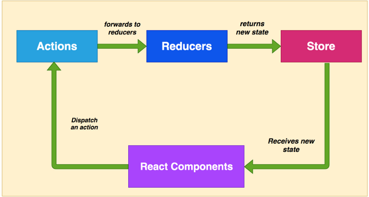 Reducers:Reducers 是纯函数,它将 action和当前 state 作为参数,计算必要的逻辑并返回一个新r的state。这些 Reducers 没有任何副作用。它不会改变 state 而是总是返回 state 。