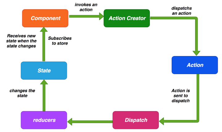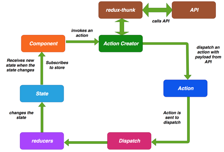 因此,我们必须使用redux-thunk从 action creators 那里进行 API 调用。Action creator 派发一个action,将来自API的数据放入action 的 payload 中。Reducers 接收我们在上面的redux循环中讨论的数据,其余的过程也是相同的。