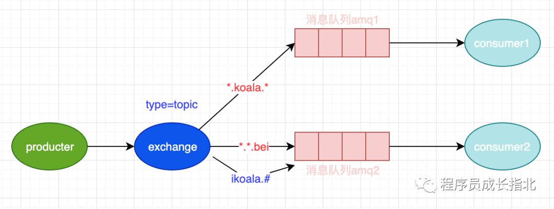 生产者指定 RoutingKey 消息根据消费端指定的队列通过模糊匹配的方式进行相应转发,两种通配符模式: #:可匹配一个或多个关键字 *:只能匹配一个关键字