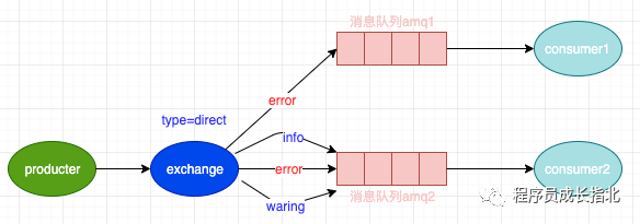 以上图的配置为例,我们以 routingKey=”error” 发送消息到Exchange,则消息会路由到 amq1 和 amq2;如果我们以 routingKey=”info” 或 routingKey=”warning” 来发送消息,则消息只会路由到 Queue2。如果我们以其他 routingKey 发送消息,则消息不会路由到这两个 Queue 中。