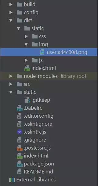 我们在dist目录下面找到了该图片。由此知道,webpack打包后,会将静态资源文件放在dist/static/img下,我们的网站实际上以dist目录作为根目录,并由此加载该目录下的index.html所需的css、js、img等。