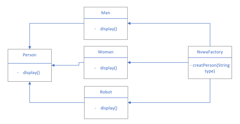 package org.example; public class Main { public static void main(String[] args) { Person man = NvwaFactory.createPerson("M"); man.display(); Person woman = NvwaFactory.createPerson("W"); woman.display(); Person robot = NvwaFactory.createPerson("R"); robot.display(); } }