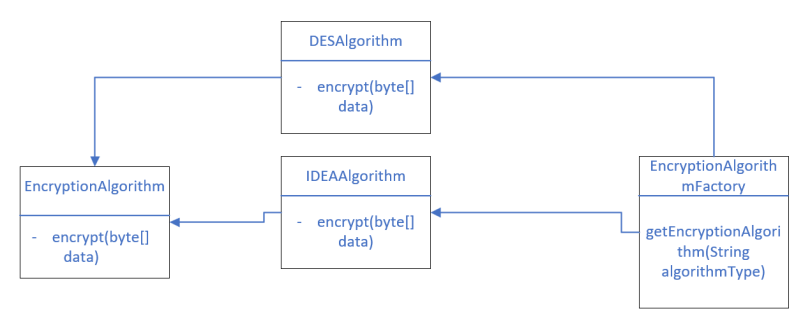 public class EncryptionAlgorithmFactory { public static EncryptionAlgorithm getEncryptionAlgorithm(String algorithmType) { if ("DES".equalsIgnoreCase(algorithmType)) { return new DESAlgorithm(); } else if ("IDEA".equalsIgnoreCase(algorithmType)) { return new IDEAAlgorithm(); } else { throw new IllegalArgumentException("Unsupported algorithm type: " + algorithmType); } } }