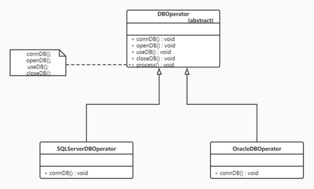 对数据库的操作一般包括连接、打开、使用、关闭等步骤,在数据库操作模板类中我们定义了connDB()、openDB()、useDB()、closeDB()四个方法分别对应这四个步骤。对于不同类型的数据库(如SQL Server和Oracle),其操作步骤都一致,只是连接数据库connDB()方法不同,现使用模板方法模式对其进行设计。