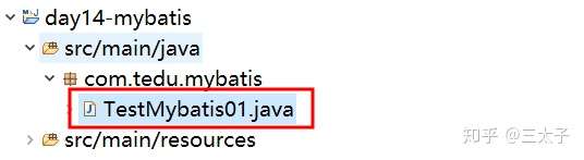3、创建com.tedu.mybatis.TestMybatis01测试类,并提供findAll方法(查询emp表中所有的员工信息),开发步骤如下:(创建测试类)