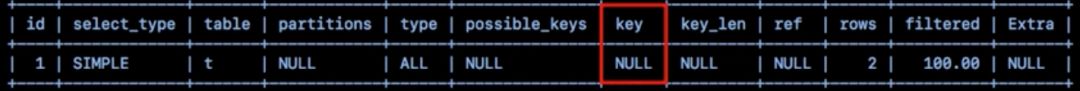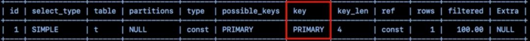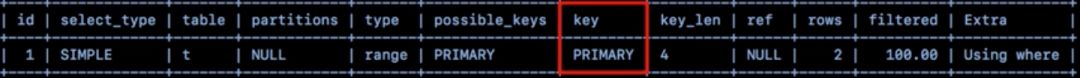 explain select * from t where id=2;的KEY结果是PRIMARY,就是我们常说的使用了主键索引