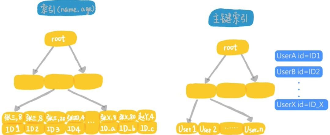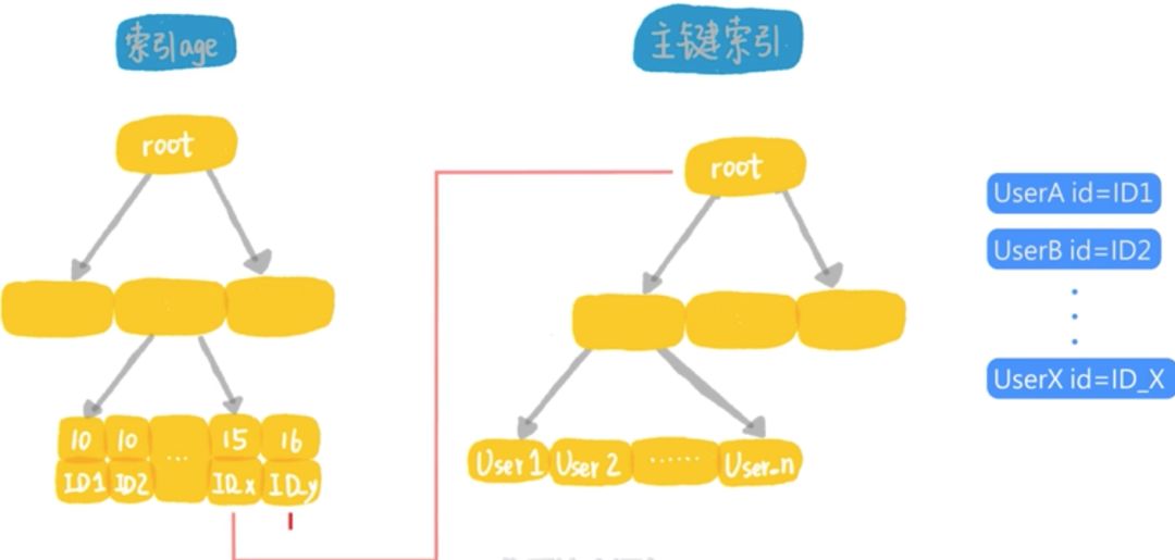 我们都知道,InnoDB是索引组织表,所有的数据都是存储在索引树上面的。比如上面的表t,这个表包含了两个索引,一个主键索引和一个普通索引。在InnoDB里,数据是放在主键索引里的。如图所示: