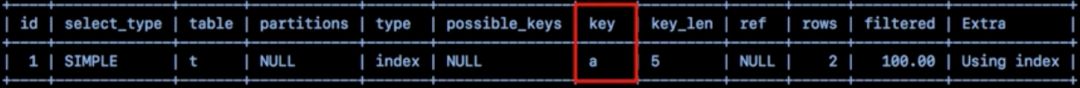 explain select a from t;的KEY结果是a,表示使用了a这个索引。