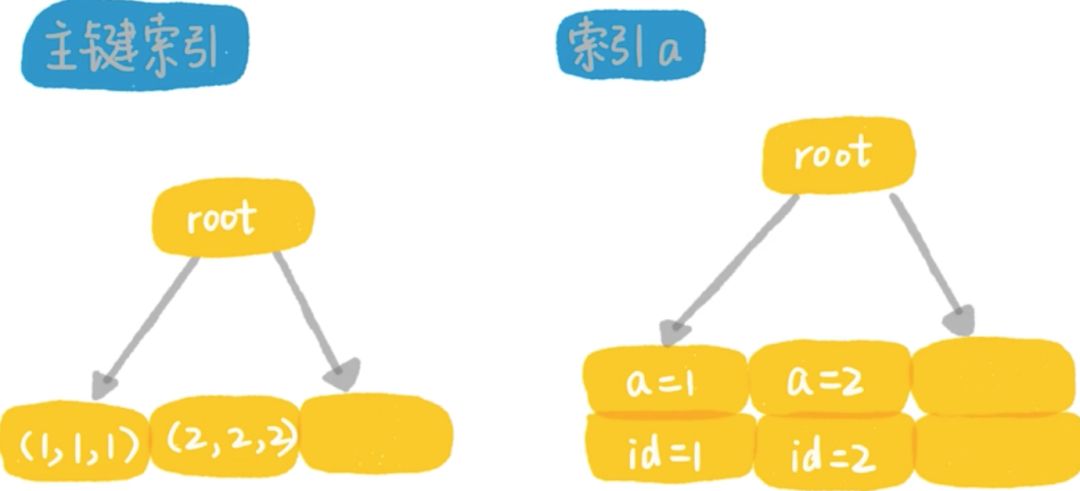 该表有三个字段,其中用id是主键索引,a是普通索引。