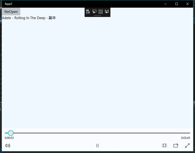 rivate async void add_Click(object sender, RoutedEventArgs e) { var openPicker = new FileOpenPicker(); openPicker.SuggestedStartLocation = Windows.Storage.Pickers.PickerLocationId.VideosLibrary; openPicker.FileTypeFilter.Add(".mp4"); openPicker.FileTypeFilter.Add(".mp3"); StorageFile file = await openPicker.PickSingleFileAsync(); if (file != null) { var mediaSource = MediaSource.CreateFromStorageFile(file); Title.Text = file.Name; myPlayer.Source = mediaSource; mediaSimple.SetMediaPlayer(myPlayer); if (file.FileType == ".mp3") { //Todo 播放音频时显示专辑封面旋转 //可通过 Ellipse 实现 } } }