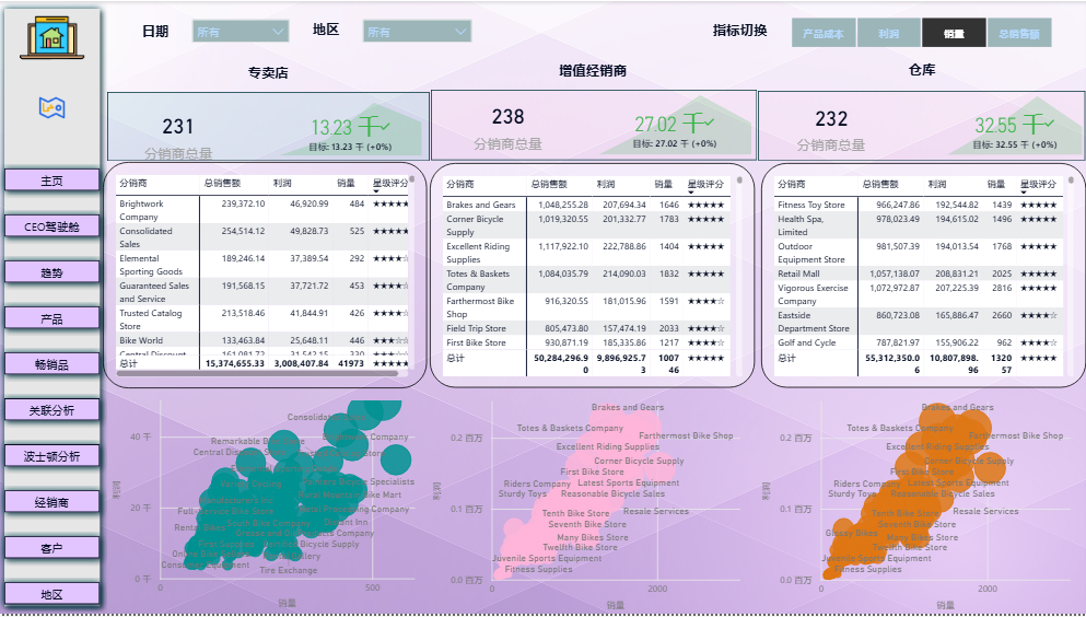 第八步:插入三个矩阵图,将分销商表中的分销商字段拖入行区域,再将度量值中的总销售额、利润、销量以及星级评分拖入值区域,将分销商表业务类型字段作为筛选条件添加给矩阵图,分别选择专业自行车店、增值经销商、仓库,使视觉对象固定显示不同业务类型的分析指标。