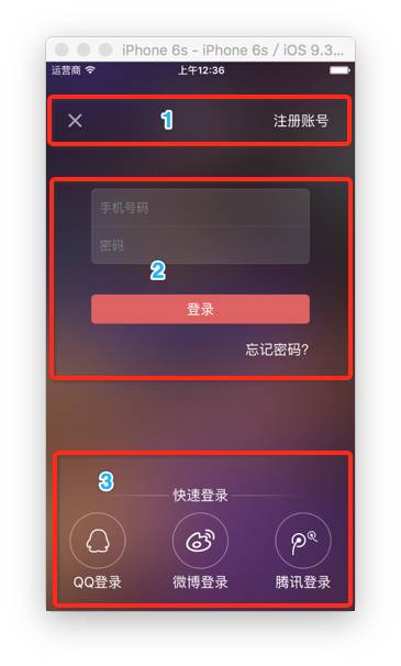 通过观察登录界面,我们发现背景图片是提供好的,因此需要使用UIImageVIew设置背景图片,另外可以将登陆界面分为三部分,每一部分用UIView当载体存放,只要View内部的控件布局好了,只需要管理三个View的位置大小几个,方便于我们布局和管理。