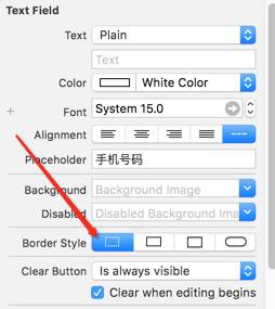 这部分的布局也很简单,这里图片中提供了textfield的背景图片,所以这里我们先用UIImageView将背景图片显示,然后在在图片上添加一个透明的textfield,所以textfield的样式需要选择无边框隐形的