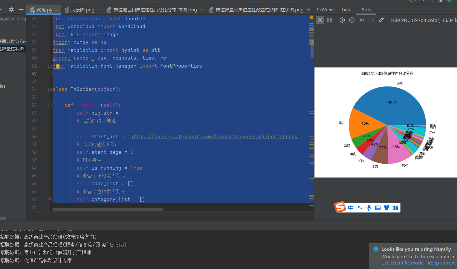 import jieba from collections import Counter from wordcloud import WordCloud from PIL import Image import numpy as np from matplotlib import pyplot as plt import random, csv, requests, time, re from matplotlib.font_manager import FontProperties class TXSpider(object): def __init__(self): self.big_str = '' # 起始的请求地址 self.start_url = 'https://careers.tencent.com/tencentcareer/api/post/Query' # 起始的翻页页码 self.start_page = 1 # 翻页条件 self.is_running = True # 准备工作地点大列表 self.addr_list = [] # 准备岗位种类大列表 self.category_list = [] def parse_start_url(self): # 条件循环模拟翻页 while self.is_running: # 构造请求参数 params = { # 捕捉当前时间戳 'timestamp': str(int(time.time() * 1000)), 'countryId': '', 'cityId': '', 'bgIds': '', 'productId': '', 'categoryId': '', 'parentCategoryId': '', 'attrId': '', 'keyword': '', 'pageIndex': str(self.start_page), 'pageSize': '10', 'language': 'zh-cn', 'area': 'cn' } headers = {'user-agent': random.choice(USER_AGENT_LIST)} response = requests.get(url=self.start_url, headers=headers, params=params).json() """调用解析响应方法""" self.parse_response_json(response) """翻页递增""" self.start_page += 1 """翻页终止条件""" if self.start_page == 20: self.is_running = False """翻页完成,开始生成分析图""" self.crate_img_four_func()
