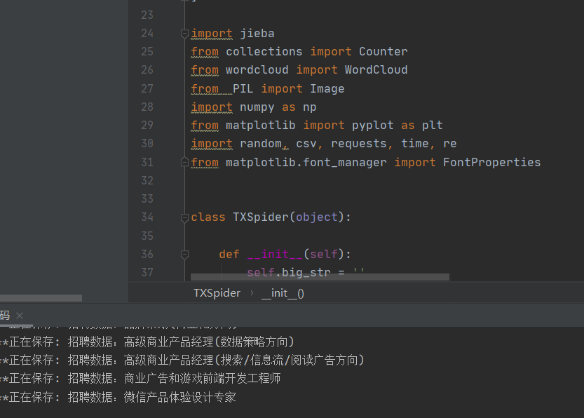 def save_excel(self, data_dict): ''' 保存数据 ''' with open(r'./{}.csv'.format('招聘数据'), 'a+', newline='', encoding='gbk') as file_csv: csv_writer = csv.writer(file_csv, delimiter=',') csv_writer.writerow(data_dict['岗位详情']) print(r'***正在保存: 招聘数据:{}'.format(data_dict['岗位详情'][0])) def show_image(self):