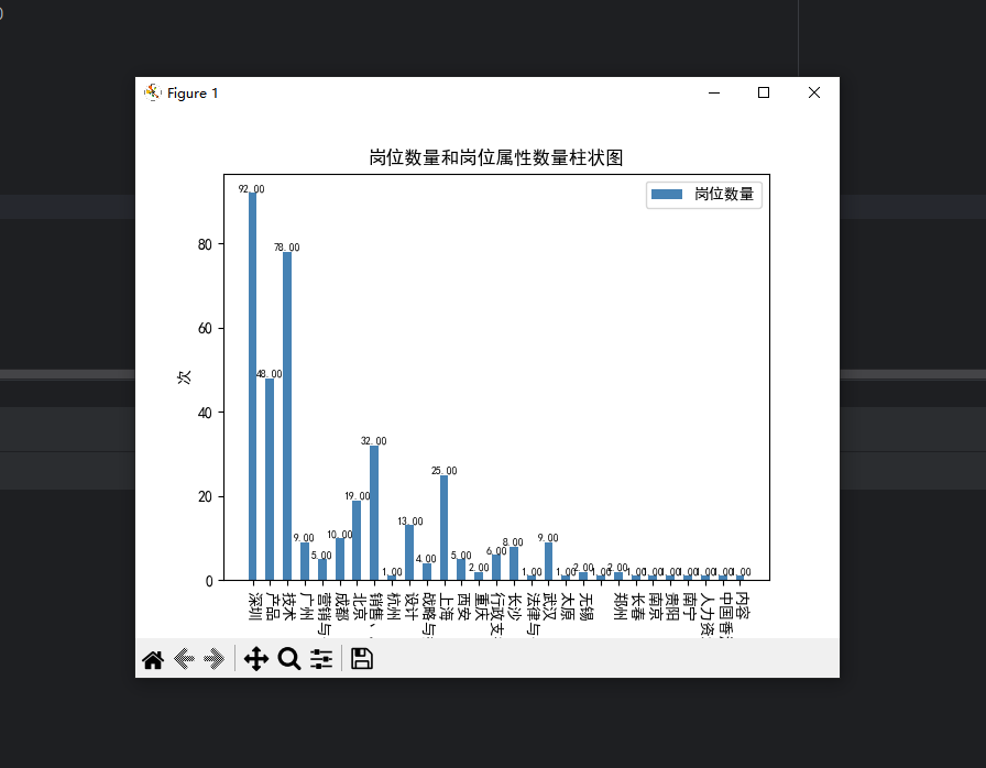 '''根据岗位地址和岗位属性二者数量生成柱状图''' import matplotlib;matplotlib.use('TkAgg') plt.rcParams['font.sans-serif'] = ['SimHei'] plt.rcParams['axes.unicode_minus'] = False zhfont1 = matplotlib.font_manager.FontProperties(fname='C:\Windows\Fonts\simsun.ttc') name_list = [name for name in data.keys()] num_list = [value for value in data.values()] width = 0.5 # 柱子的宽度 index = np.arange(len(name_list)) plt.bar(index, num_list, width, color='steelblue', tick_label=name_list, label='岗位数量') plt.legend(['分解能耗', '真实能耗'], prop=zhfont1, labelspacing=1) for a, b in zip(index, num_list): # 柱子上的数字显示 plt.text(a, b, '%.2f' % b, ha='center', va='bottom', fontsize=7) plt.xticks(rotation=270) plt.title('岗位数量和岗位属性数量柱状图') plt.ylabel('次') plt.legend() plt.savefig(f'岗位数量和岗位属性数量柱状图-柱状图', bbox_inches='tight') plt.show()