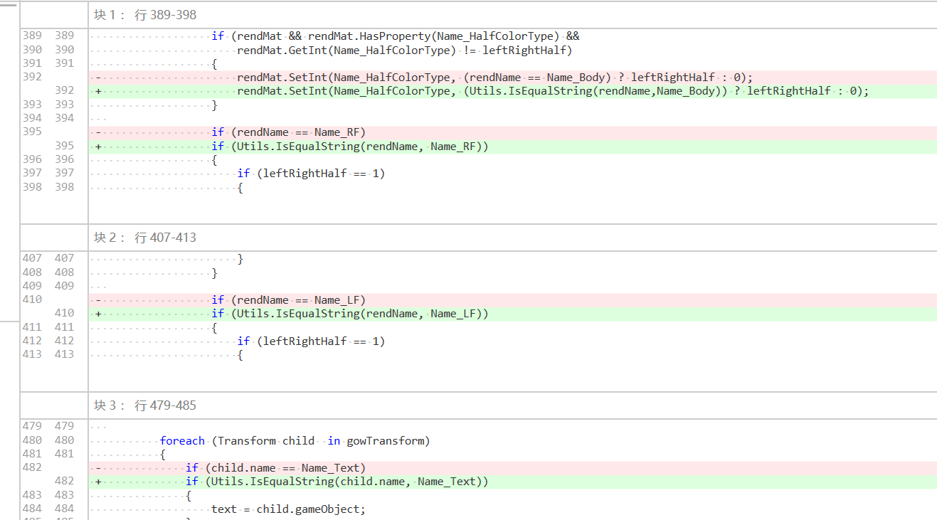 1 for(int i = 0; i < count; i++) 2 { 3 ... 4 Vector2 p1l_uv = new Vector2(offest.x, uvStart / 10f); 5 Vector2 p1r_uv = new Vector2(offest.y, uvStart / 10f); 6 Vector2 p2l_uv = new Vector2(offest.x, (uvStart + distance) / 10); 7 Vector2 p2r_uv = new Vector2(offest.y, (uvStart + distance) / 10); 8 ... 9 } 10 11 // 可以将对象创建挪到循环外进行复用 12 13 Vector2 p1l_uv = new Vector2(); 14 Vector2 p1r_uv = new Vector2(); 15 Vector2 p2l_uv = new Vector2(); 16 Vector2 p2r_uv = new Vector2(); 17 18 for(int i = 0; i < count; i++) 19 { 20 ... 21 // 同时可以使用Vector3.Set来一次性对向量的每个分量进行赋值 22 p1l_uv.Set(offest.x, uvStart / 10f); 23 p1r_uv.Set(offest.y, uvStart / 10f); 24 p2l_uv.Set(offest.x, (uvStart + distance) / 10); 25 p2r_uv.Set(offest.y, (uvStart + distance) / 10); 26 ... 27 }