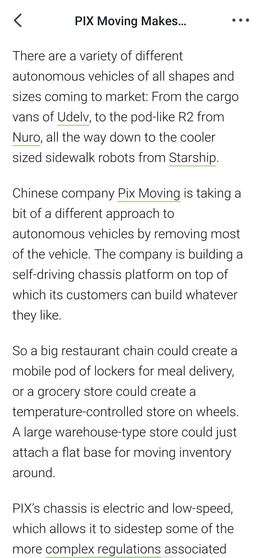 由于其平台的灵活性,PIX 值得被关注,尤其是在与食品配送相关的领域。通过推动将货物配送给顾客的货舱设计(餐馆、杂货店等),这些舱体可以根据特定的需求(尺寸、温度等)来进行定制。这可以创建更有效的交付方式,从而产生更多的自主交付需求。