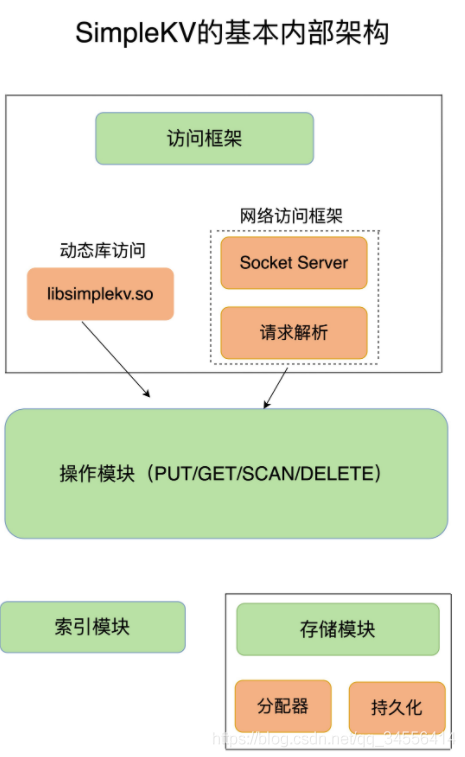 个键值数据库包括了访问框架、索引模块、操作模块和存储模块四部分(见下图)