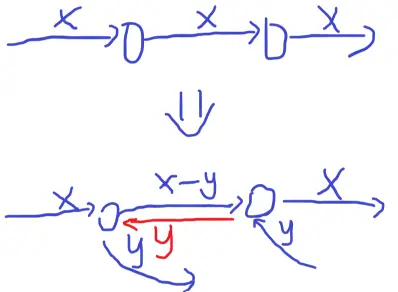考虑对于每个边建立反向边,初始的容量为 \(0\)。每次增广时,一条边容量减 \(x\),其反向边容量加 \(x\)。结合下图理解: