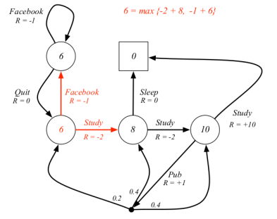 解释:它有两个action一个是Study对应的立即奖励是R=-2,一个是Facebook对应的是R=-1,我们要求 ,则是从这两个动作挑一个能得到最大值的action,又因为