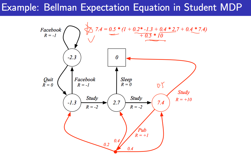 解释:从A状态(设7.4那个状态为A状态)出来有两动作,一个是study一个是Pub,每个动作的概率为0.5,则对应上上面公式是 ,我们先看通过Study的action,发现它转移到了终止状态,