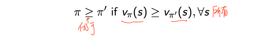最优策略:遵循策略 π 的价值都>=遵循策略 π' 下的价值,对任何状态s都成立: