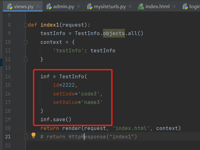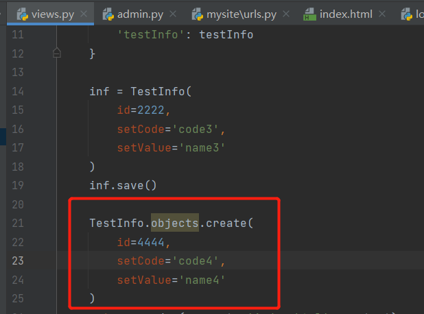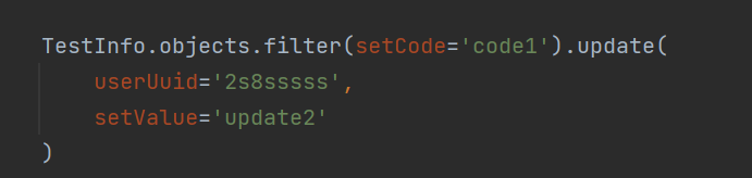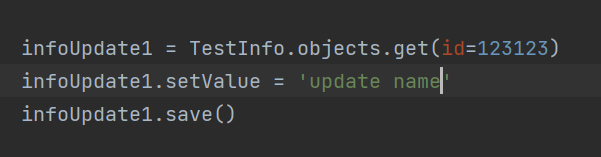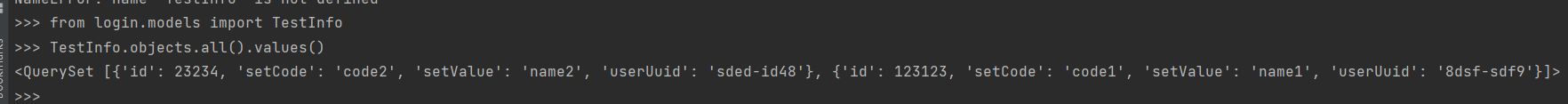 # 如果ID不存在,则提示错误:TestInfo matching query does not exist. # get查询出多条记录,则提示错误:get() returned more than one TestInfo -- it returned 2 testInfo1 = TestInfo.objects.get(id=123) # 查询列表 testInfo = TestInfo.objects.all() # 指定条件查询,如果查询不到不会报错,多条则返回list,可以多个查询条件组合查询 testInfo2 = TestInfo.objects.filter(setCode='code2').filter(setValue='name2') # 求count testInt = TestInfo.objects.count() #排除,类似于not testInfo2 = TestInfo.objects.exclude(id=2222)