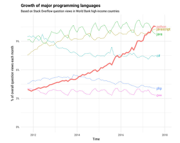 Python的兴起与人们对数据科学兴趣的兴起相关。