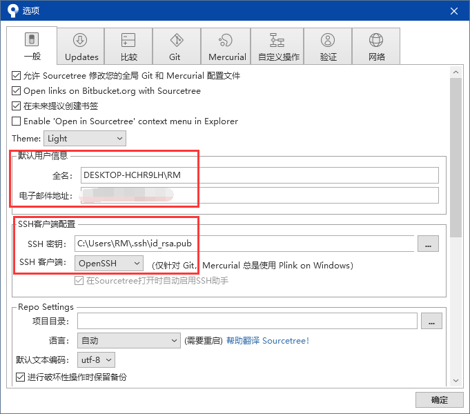 1. 打开sourcetree,点击"工具-->选项-->一般",选择SSH密钥的位置为刚刚生成密钥的路径,SSH客户端选择OpenSSH,点击确定。