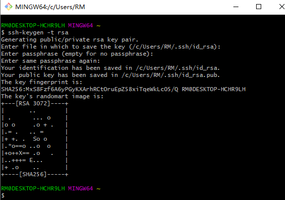 2. 生成秘钥。打开Git,执行命令:ssh-keygen -t rsa,默认安装路径在"C:\Users\Administrator\.ssh”目录下,一直按回车,不用输入密码。