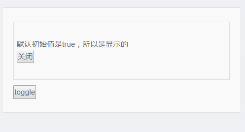 1 <template> 2 <div class="details"> 3 <myComponent :show.sync='valueChild' style="padding: 30px 20px 30px 5px;border:1px solid #ddd;margin-bottom: 10px;"></myComponent> 4 <button @click="changeValue">toggle</button> 5 </div> 6 </template> 7 <script> 8 import Vue from 'vue' 9 Vue.component('myComponent', { 10 template: `<div v-if="show"> 11 <p>默认初始值是{{show}},所以是显示的</p> 12 <button @click.stop="closeDiv">关闭</button> 13 </div>`, 14 props:['show'], 15 methods: { 16 closeDiv() { 17 this.$emit('update:show', false); //触发 input 事件,并传入新值 18 } 19 } 20 }) 21 export default{ 22 data(){ 23 return{ 24 valueChild:true, 25 } 26 }, 27 methods:{ 28 changeValue(){ 29 this.valueChild = !this.valueChild 30 } 31 } 32 } 33 </script>