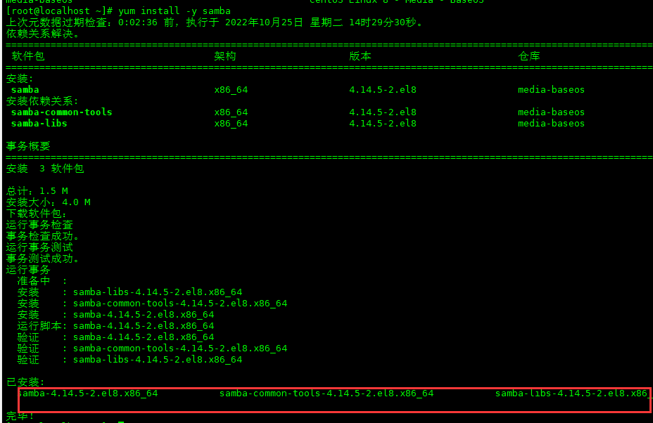 (3)使用yum命令安装samba服务 安装了2个依赖包