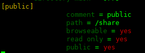 4.设置匿名访问。 设置是否允许对共享资源进行匿名访问,可以更改public字段。格式: public = yes #允许匿名访问 public = no #禁止匿名访问