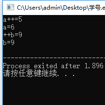 #include <stdio.h> int main() { int a=5,b=8; printf("a++=%d\n",a++) ; printf("a=%d\n",a); printf("++b=%d\n",++b); printf("b=%d\n",b); return 0; }