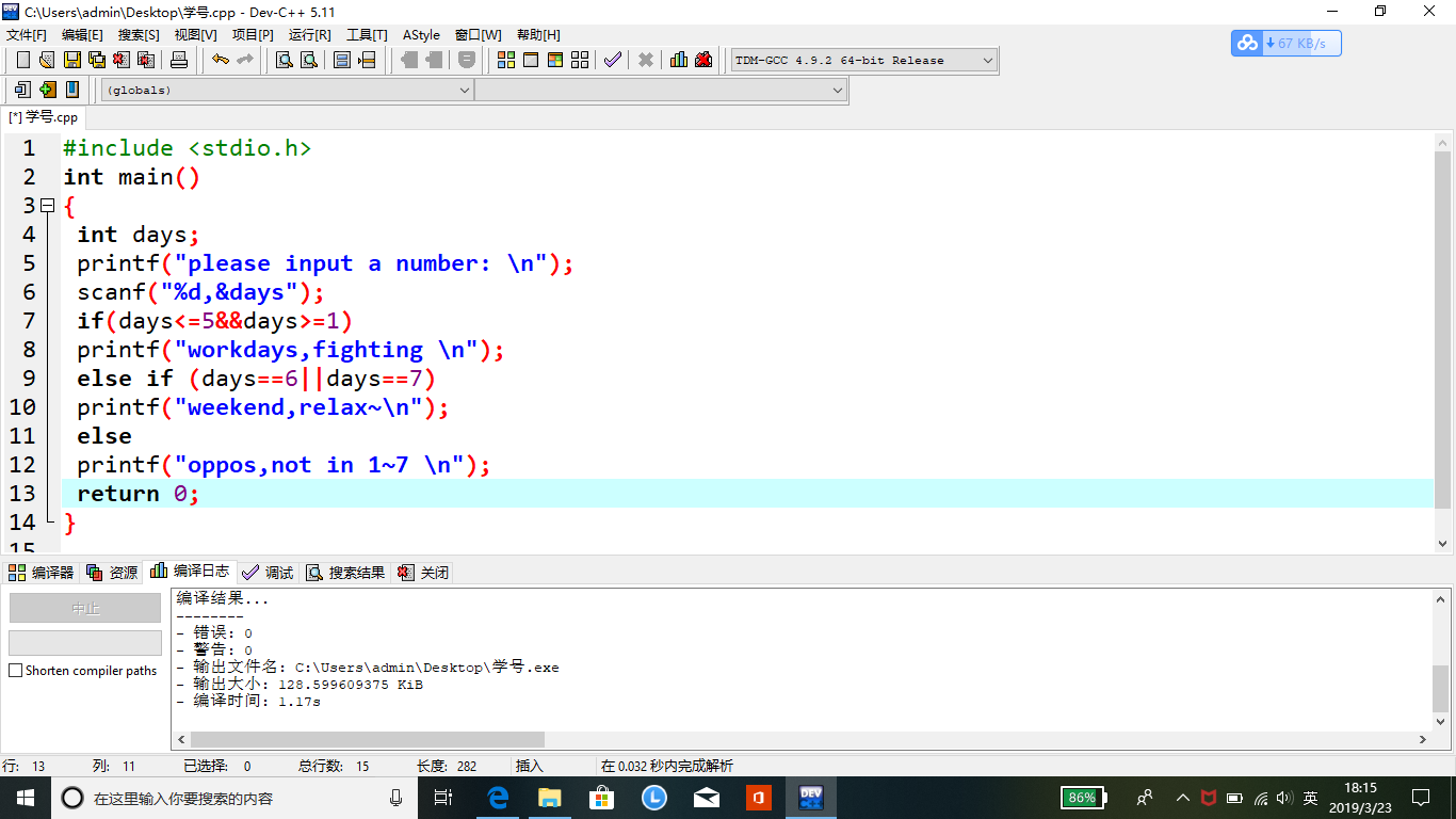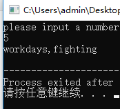 #include <stdio.h> int main() { int days; printf("please input a number: \n"); scanf("%d",&days); if(days<=5&&days>=1) printf("workdays,fighting \n"); else if (days==6||days==7) printf("weekend,relax~\n"); else printf("oppos,not in 1~7 \n"); return 0; }