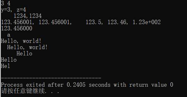 #include <stdio.h> int main() { int x=1234; float f=123.456; double m=123.456; char ch='a'; char a[]="Hello,world!"; int y=3 ,z=4; printf("%d,%d\n",y,z); printf("y=%d, z=%d\n", y,z); printf("%8d,%2d\n",x,x); printf("%f,%8f,%8.1f,%0.2f,%.2e\n",f,f,f,f,f); printf("%lf\n", m); printf("%3c\n",ch); printf("%s\n%15s\n%10.5s\n%2.5s\n%.3s\n",a,a,a,a,a); return 0; }