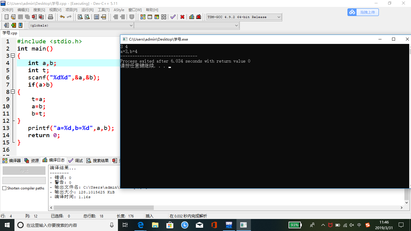 #include <stdio.h> int main() { int a,b; int t; scanf("%d%d",&a,&b); if(a>b) { t=a; a=b; b=t; } printf("a=%d,b=%d",a,b); return 0; }