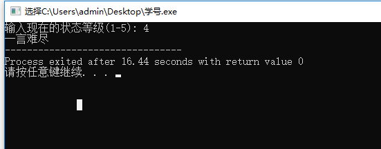 #include <stdio.h> int main() { int level; printf("输入现在的状态等级(1-5): "); scanf("%d",&level); if(level==1) printf("high翻了\n"); else if(level==2) printf("low爆了\n"); else printf("一言难尽"); return 0; }