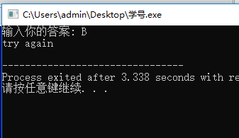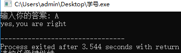 #include <stdio.h> int main() { char answer; printf("输入你的答案: "); scanf("%c",&answer); switch(answer) { case 'A':printf("yes,you are right\n");break; default:printf("try again\n"); } return 0; }