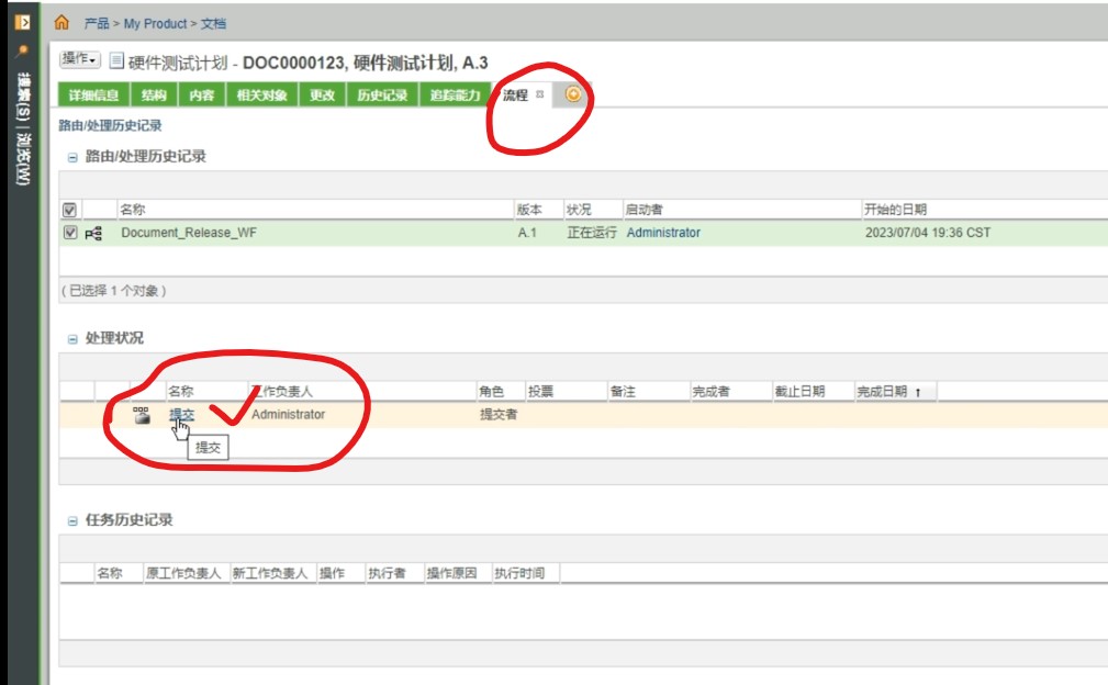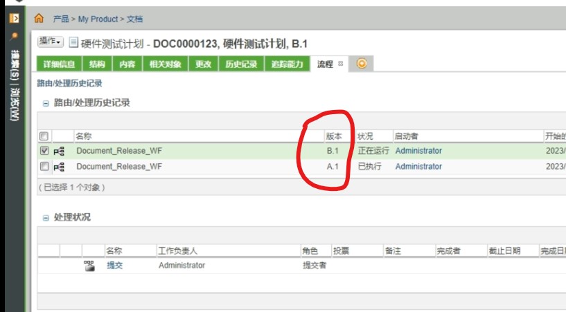 那么在历史记录当中可以看到,我们刚才修改了一个记录,文档创建和修改完成了之后,那么我们就可以走一个评审的流程,将这个文档变成一个正式的一个状态