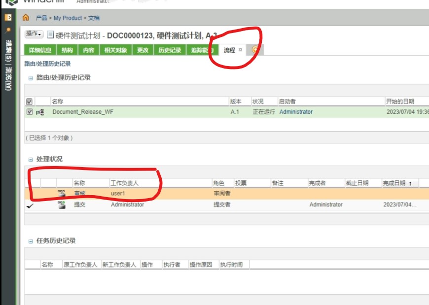 然后我们再为批准者设置参与者,我们将它设置为user1,设置完了之后我们就可以提交流程,点击完成任务,那么我们再打开这个文档的流程,页签里面,