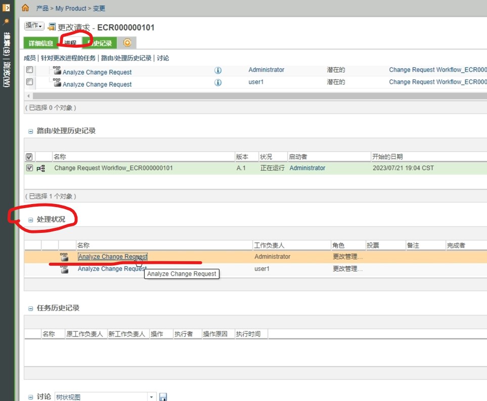 我们点击进程看一下他的流程情况,现在是到了分析变更请求,这样一个节点,我还是用管理员去完成这个审批任务,