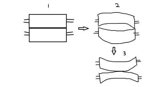 辊压中会出现一些问题,如图,正常辊压是1,在辊压开始后,由于极片厚度,会出现2那样的情况,中间厚两边薄,这个严重会造成卷绕跑偏。国外有一种类似于3那样的辊压机,增加一定的压力,能够缓解极片面密度不一致。